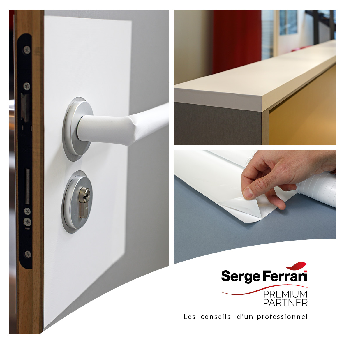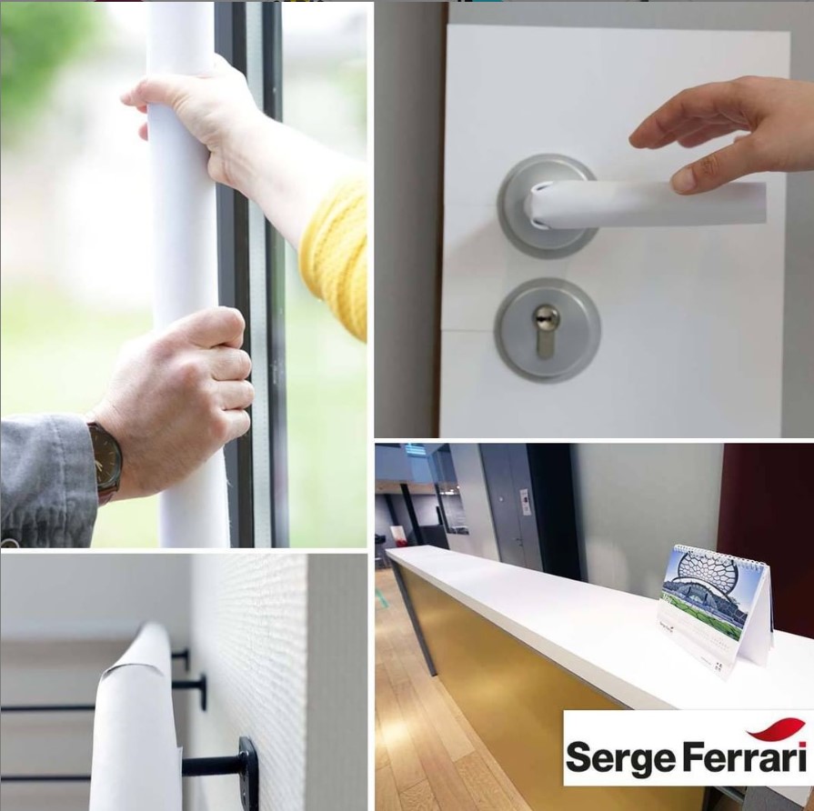 Nous sommes fiers, en tant que membre du réseau Serge Ferrari Premium Partner, de vous annoncer la disponibilité de la toile AGIVIR, dotée de propriétés antivirales. Agivir est accessible sous forme de protection adhésive, idéale pour constituer des plaques de propreté de portes et pour recouvrir les comptoirs ou les bureaux. Cette protection haute performance est modulable en fonction du lieu d’installation.